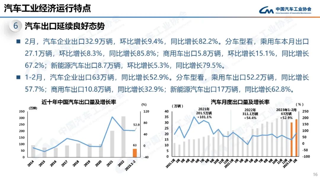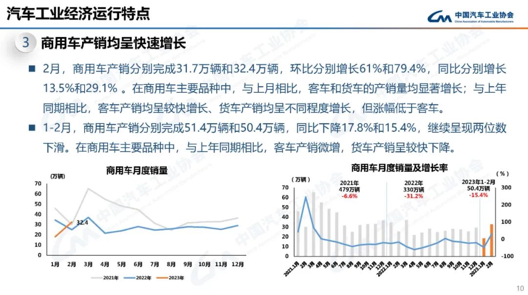 据中国汽车工业协会统计分析,2023年2月,因去年同期及今年1月均为春节月,基数相对较低,汽车产销环比、同比均呈明显增长。其中,乘用车产销呈两位数增长,商用车产销环比同比均呈两位数增长,新能源汽车和汽车出口延续良好表现。
